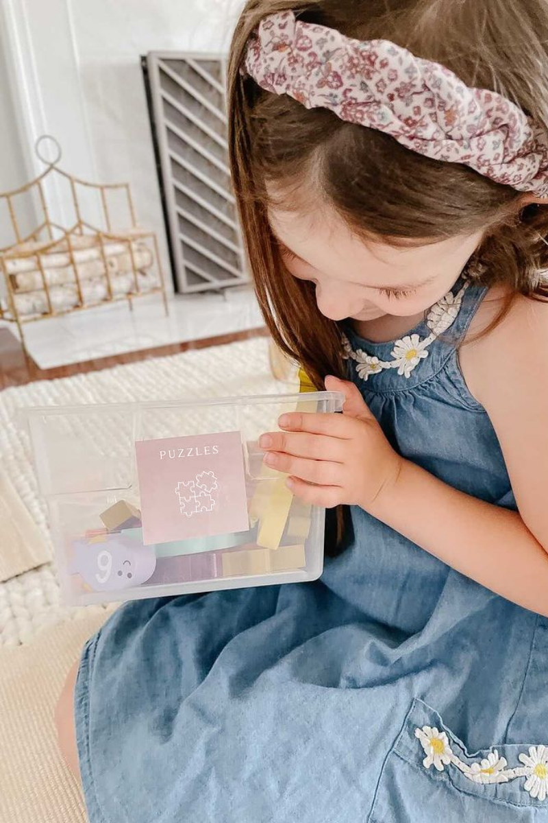 Organizing Toys & Teaching Kids to Clean Up with Toy Bin Labels Putting the PeeWee Peel labels on your toy bins makes it easy for you AND your child to know which toys can be found in which bins. This also helps speed up cleanup. The labeled bins create order on your shelves and also add a fun splash of color. PeeWee Peels look great in a kid's bedroom, daycare, or playroom.